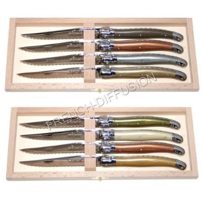 Authentic LAGUIOLE Dubost - 8 STEAK KNIVES in HEAVIER 25/10 - MULTI soft pastel-dark colors: pearl - caramel - pepper - brown - olive green - grey - copper - mastic (original table flatware/cutlery set - stainless steel - direct from FRANCE) Review