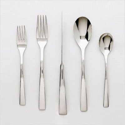Ginkgo President 45PC Place Setting is very modern and sleek in design. This set, that includes 8 dinner forks, 8 salad forks, 8 dinner knifes, 8 dinner soups and 8 tea spoons, as well as a 5-piece hostess set is made from 18/0 stainless steel. This set will accomodate 8 people at the table. The hostess set includes 1 solid serving spoon, 1 slotted serving spoon, 1 cold meat fork, 1 sauce ladel and 1 butter knife. The lines and arc to each piece are wonderful to look at as well as easy to hold and use. Do no be afraid of this design! It is very trendy and yet utilitarian as well. The President collection is also available as a 5pc, 20pc and a 4 piece hostess set. Designed by Ginkgo to enhance the look of your table and feel good in your hand! Dishwasher safe. Bon apetite!