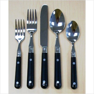 The four place settings in this 20-piece starter each consist of an 8-1/2-inch dinner knife, 7-3/4-inch dinner fork, 6-3/4-inch salad fork, 7-3/4-inch soup spoon, and 6-1/2-inch teaspoon. A handy, all-purpose design, the knife blades are not only rounded, to easily spread butter or mayonnaise, but slightly serrated, so you can cut barbecued chicken right off the grill. The handles are break-resistant, and even the white plastic is stain-resistant. Best of all, the flatware is dishwasher-safe. --Ann Bieri
