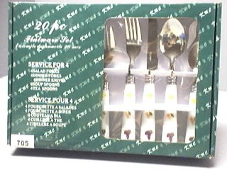 BRAND NEW Mixed Fruit 20-piece Flatware Set. This is really a beautiful set with a beautiful design. Each piece has very nice pictures of different fruit on them (Grapes,Bananas, etc.). They are all of standard size.