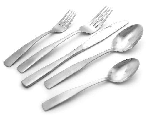 A nicely affordable choice for everyday use, this 45-piece set of Arielle Frosted flatware from Hampton Forge offers service for 8-great for larger families or for frequent entertaining. This set includes 8-piece each of the following flatware: salad fork, dinner fork, dinner knife, dinner spoon, and teaspoon. It also includes a bonus of 1 cold meat fork, 1 butter knife, 1 solid serve spoon, 1 slotted serve spoon, and 1 sugar shell. Made of 18/0 stainless steel. 1.8/1.5 gauge. Dishwasher safe with use of non-citrus detergent.
